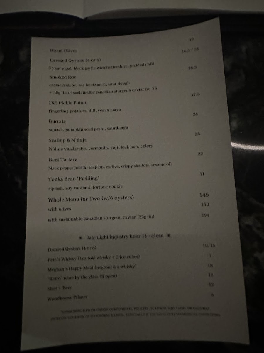 The menu features enticing options such as dressed oysters with black garlic Worcestershire, dill pickle potato fingerlings with vegan mayo, and luxurious Canadian sturgeon caviar. Each dish is thoughtfully crafted, showcasing fresh ingredients and innovative preparations.
